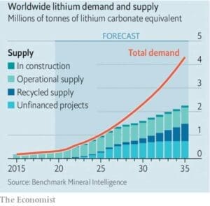 Many object that lithium prices have decreased in recent years, indicating a surplus of lithium. It doesn’t: it indicates that supply has grown faster than demand. This will be rectified if the energy transition proceeds as planned. Recent analysis by Benchmark Mineral Intelligence shows, even with rapid growth of recycling (using methods as yet undeveloped) and a large projection of new projects, supply fails to keep pace with ever-increasing demand. And the levelling-out of new projects shows how new supply will hit the ceiling of recoverable resources in the earth’s crust.