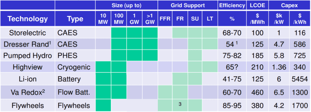 CAES, pumped hydro, poss. heat |