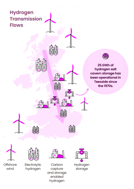 Electrolysis using surplus renewable power enables hydrogen production without emissions, while salt cavern storage is highlighted to both ensure continuity of supply during periods of low generation, and to store the massive amounts of hydrogen needed for full industrial decarbonisation